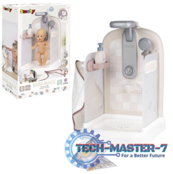 Prysznic z głowicą prysznicową, pojemnikiem na wodę i butelką na żel pod prysznic.