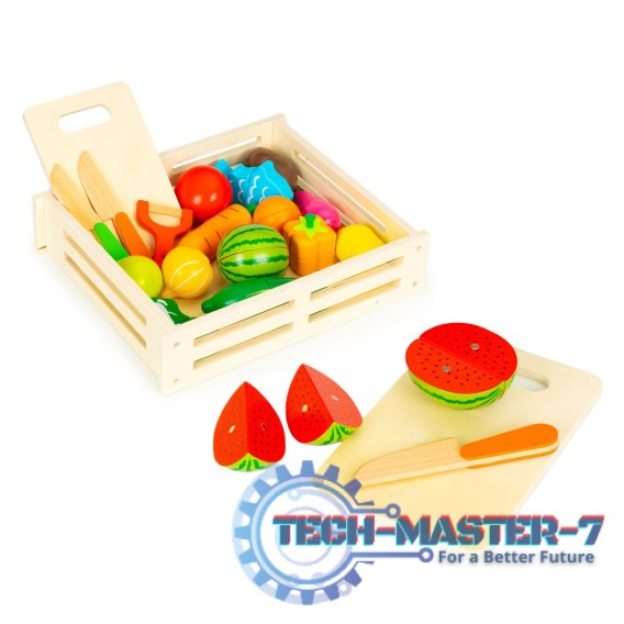 Najbardziej fascynującą cechą tego zestawu jest możliwość krojenia warzyw i owoców za pomocą drewnianego nożyka. Zabawkowe jedzenie składa się z połówek połączonych rzepem, który podczas krojenia stawia delikatny opór i wydaje dźwięk, jak podczas krojenia prawdziwych owoców. Dzięki temu dzieci,rozwijają swoje zdolności motoryczne oraz uczą się podstawowych umiejętności, takich jak na przykład używanie noża.