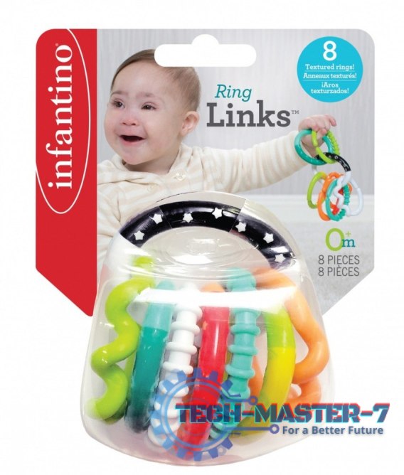 Kolorowe kółka łączą się ze sobą we wzorzysty łańcuch. Każdy element posiada wyjątkową fakturę stymulującą zmysł dotyku. Stworzony z myślą o kreatywnej zabawie. 8 elementów daje nieograniczone możliwości łączenia ich ze sobą. Może być grzechotką. Bez BPA.