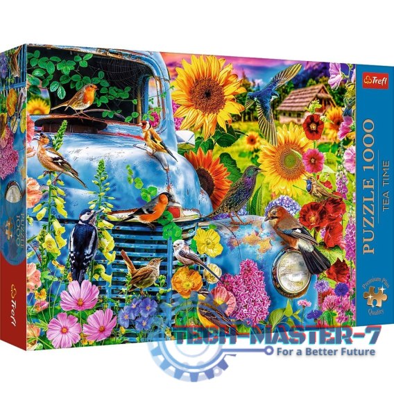 Puzzle Wiejska sielanka: Śpiewające Ptaki przedstawiają stare auto w otoczeniu ptaków oraz kwiatów. Po ich ułożeniu powstanie obraz o wymiarach 68,3 x 48 cm.