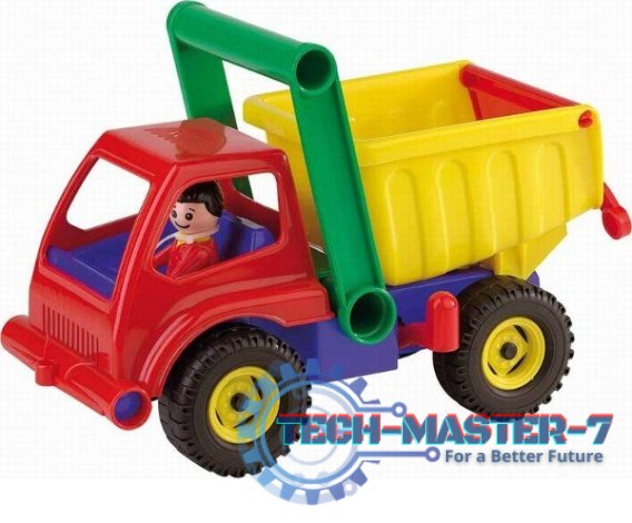 Super kolorowa wywrotka z wysokimi burtami. Pojazd posiada 2 osie i blokadę naczepy. Ponad kabiną znajduje się rączka do wygodnego sterowania pojazdem. W kabinie jest figurka kierowcy. Pojazd ma 27 cm długości.